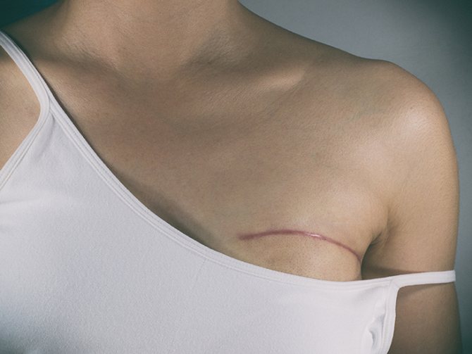 - Мастэктомия. Полное удаление опухоли и всего поражённого органа, с лежащими ниже тканями (мышцами, лимфоузлами, идущими к подмышке, возможно, и рёбрами, которые тоже могут быть поражены раком).